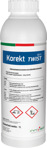 Korekt Twist 480 SL to regulator wzrostu i rozwoju roślin w formie koncentratu rozpuszczalnego w wodzie (SL). Stosowany jako środek zapobiegający wyleganiu jęczmienia, żyta, pszenżyta i pszenicy uprawianych na dobrych stanowiskach lub nawożonych wysokimi dawkami azotu.