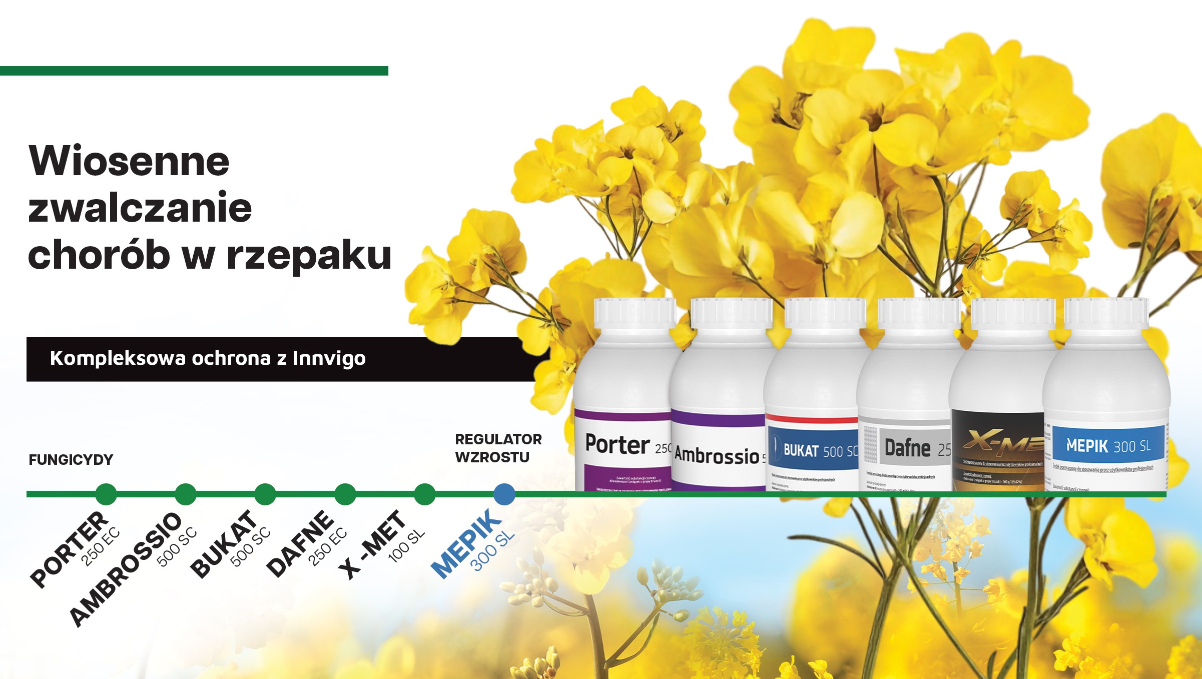 W ofercie Innvigo znajdują się między innymi fungicydy i regulatory wzrostu do ochrony rzepaku ozimego na wiosnę, tj. fungicydy i regulatory wzrostu. Szeroka paleta oprysków pozwala na zbudowanie kompletnej technologii ochrony na wiosnę tylko produktami INNVIGO.
